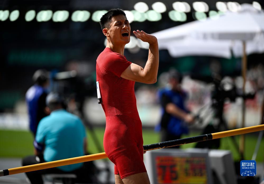 8月23日,黄博凯在资格赛中成功试跳5米75的高度后庆祝。新华社记者 李明 摄