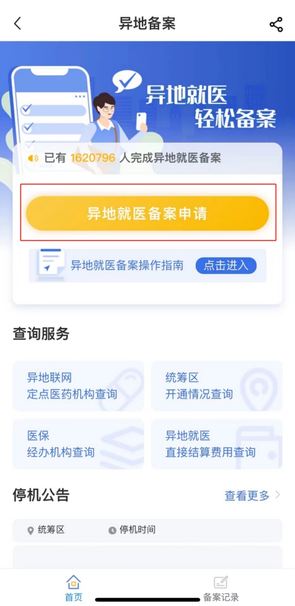 (2)跨省异地就医备案:点击“异地备案”页面中的 “异地就医备案申请”,根据信息提示进行备案。