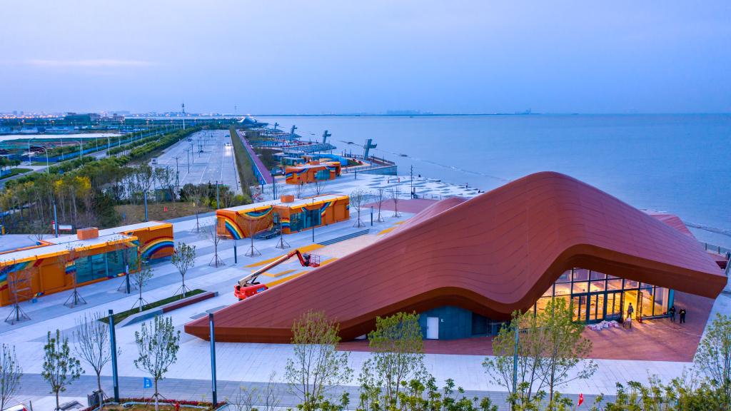 从浅滩向岸上望去,一只面朝大海的“贝壳”、一座沿海岸线起伏的“沙丘”和一架巨大的“纸飞机”映入眼帘,在这三座造型别致的游客服务中心建筑之间,冰饮、小吃等小摊店铺星罗棋布。