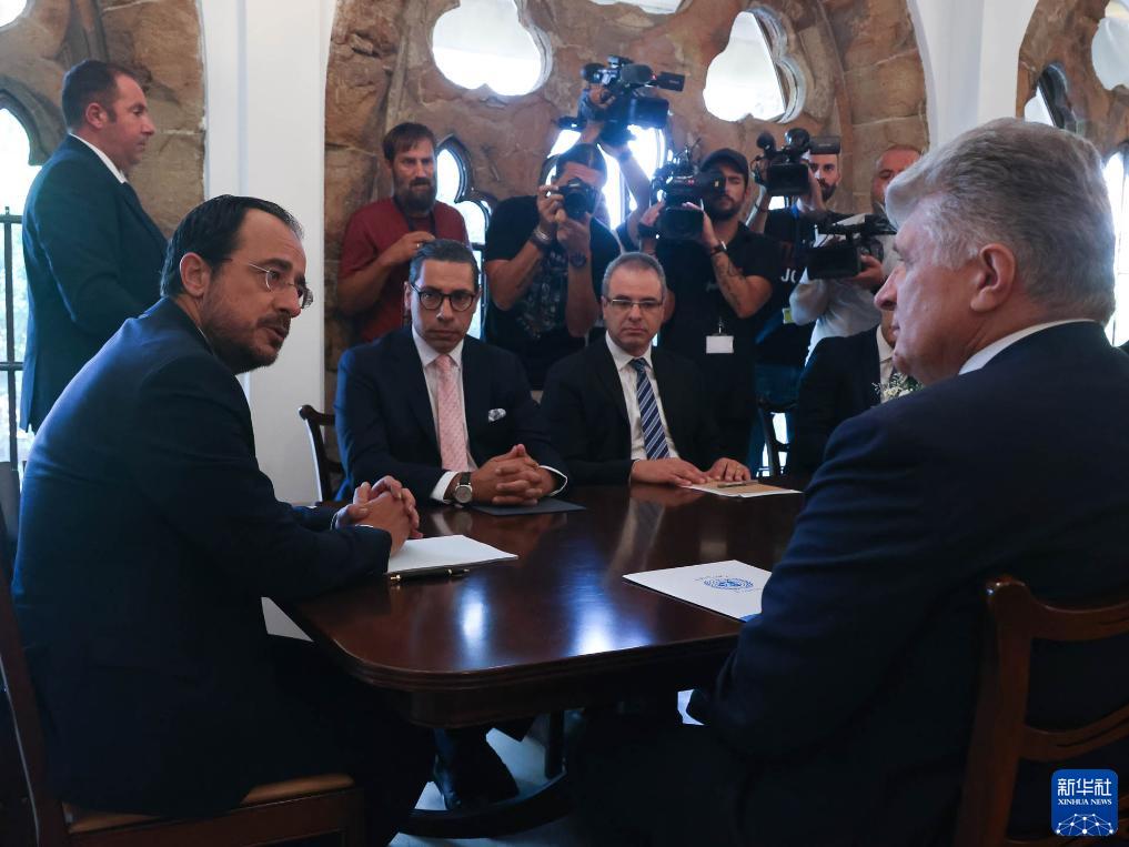 8月28日,在塞浦路斯尼科西亚,联合国负责欧洲、中亚和美洲事务的助理秘书长米洛斯拉夫·延恰(前中)与塞浦路斯希腊族领导人、总统赫里斯托祖利季斯(前右)举行会谈。新华社发(塞浦路斯新闻局供图)