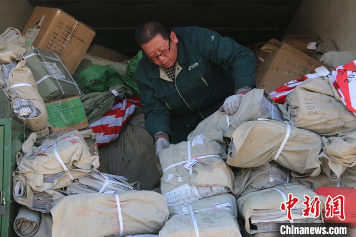 杨全忠正在帮忙装卸邮袋。 受访者供图。