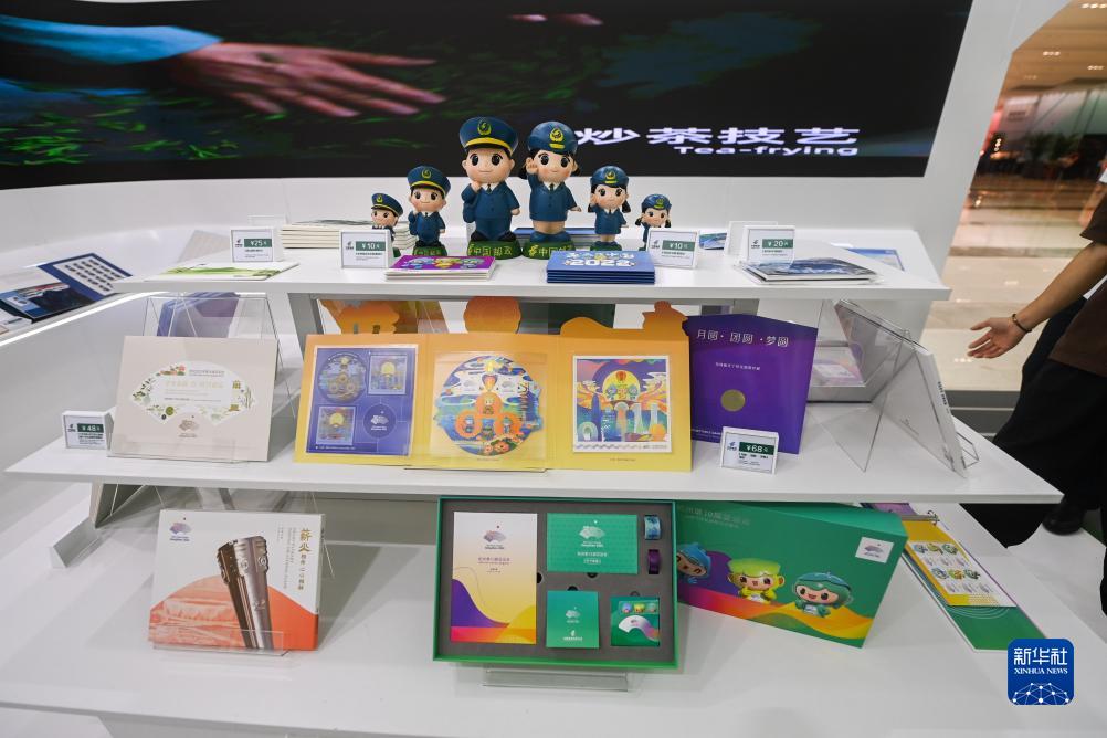 这是主媒体中心序厅内展示的各类亚运主题邮票、明信片等(9月1日摄)。新华社记者 徐昱 摄