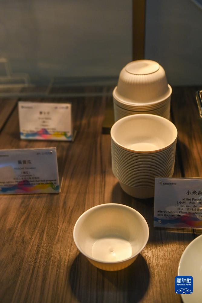这是主媒体中心媒体记者餐厅内使用的可降解环保餐具(9月1日摄)。新华社记者 徐昱 摄
