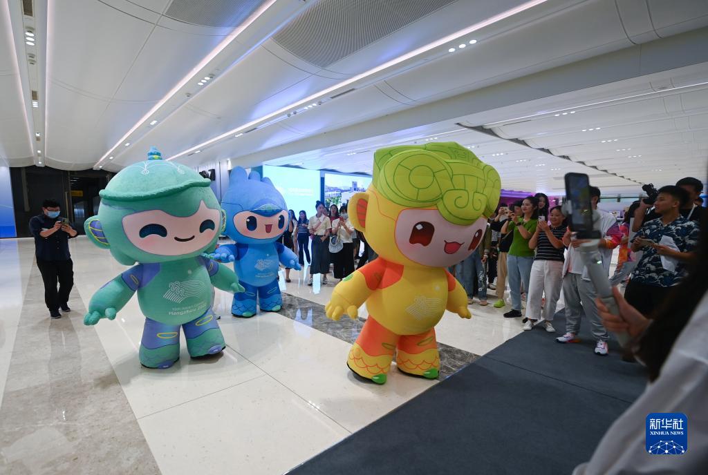亚运会吉祥物“琮琮”“莲莲”“宸宸”在主媒体中心与记者互动(9月1日摄)。新华社记者 徐昱 摄