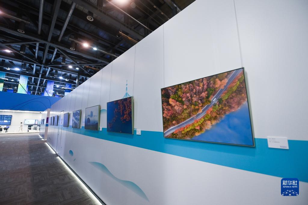 这是主媒体中心工作间墙壁上悬挂的浙江风光照片(9月1日摄)。新华社记者 徐昱 摄