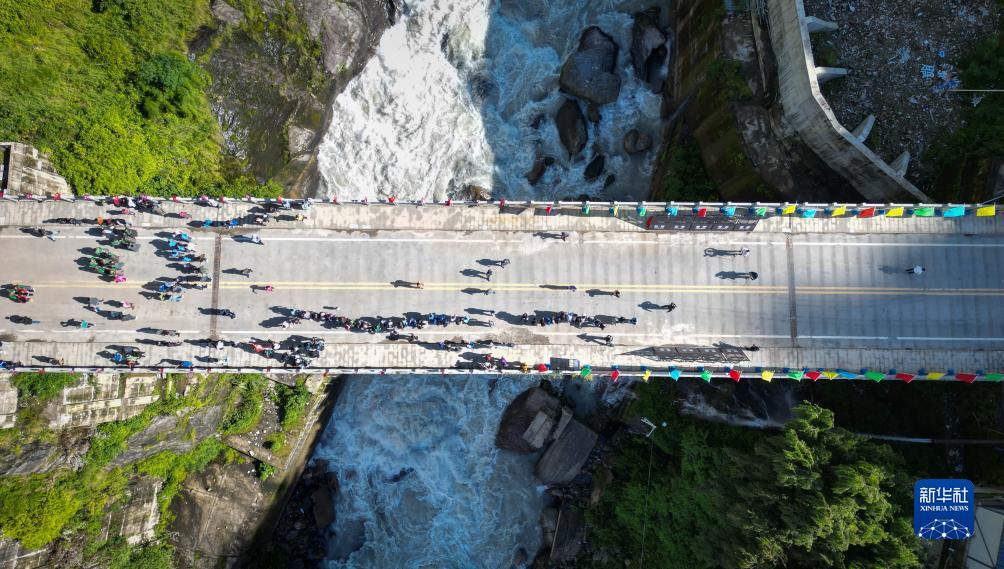 9月1日,往来中尼两国的人员跨过友谊桥(无人机照片)。新华社记者 聂毅 摄