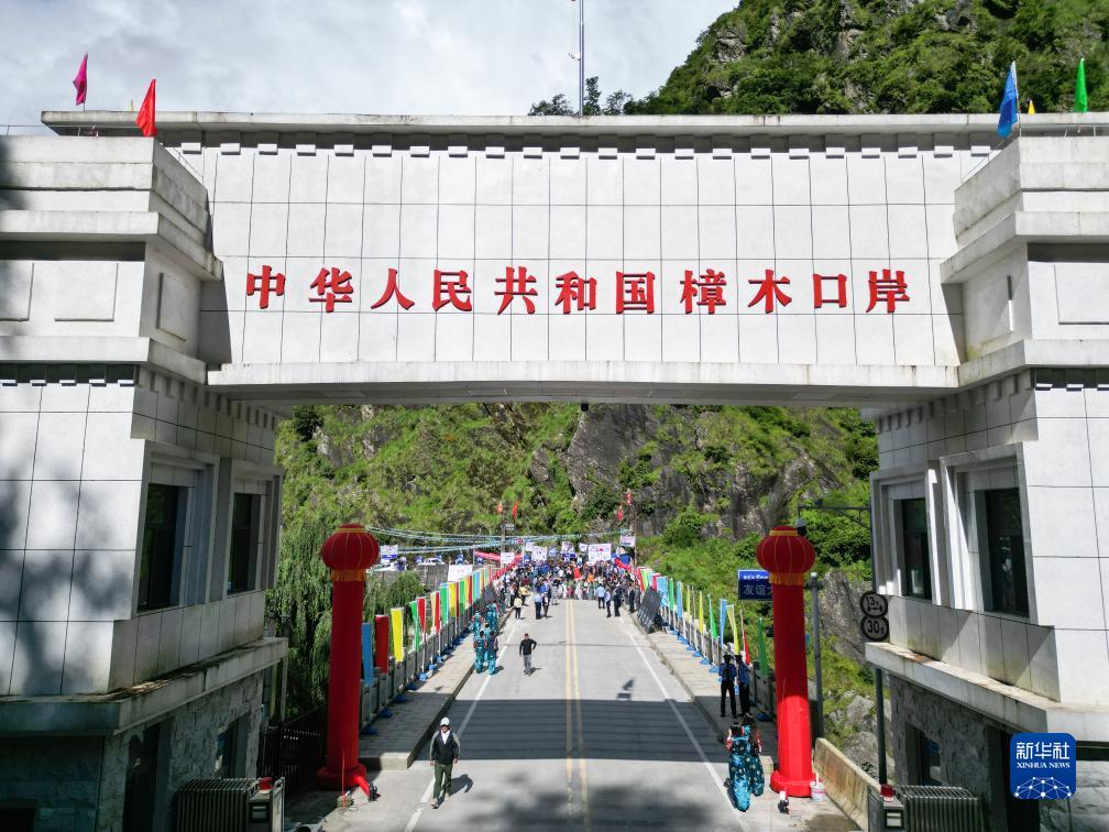 9月1日,往来中尼两国的人员跨过友谊桥(无人机照片)。新华社记者 李键 摄