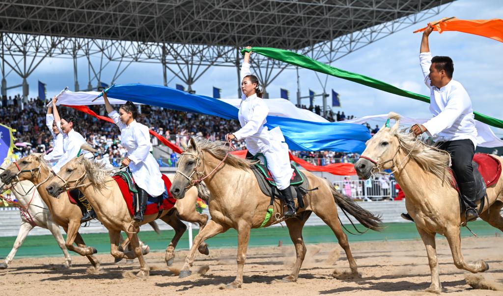 8月9日,2023兴安盟那达慕在乌兰毛都草原开幕,这是演员在开幕式上进行表演。新华社记者 贝赫 摄