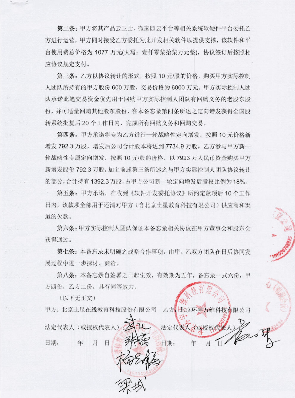 和晶科技、ST土星披露出来的仅仅是一部分信息,环宇万维与ST土星同时又签署了一份“抽屉协议”——《战略合作备忘录》(简称“《备忘录》”),约定了三项交易:软硬件平台委托运营(1077万元)、认购ST土星的定增股份(7923万元)、ST土星老股协议转让(6000万元)。《备忘录》第六条明确指出:“甲方(指ST土星)实际控制人团队保证本备忘录相关协议在甲方董事会和股东会获得通过。”