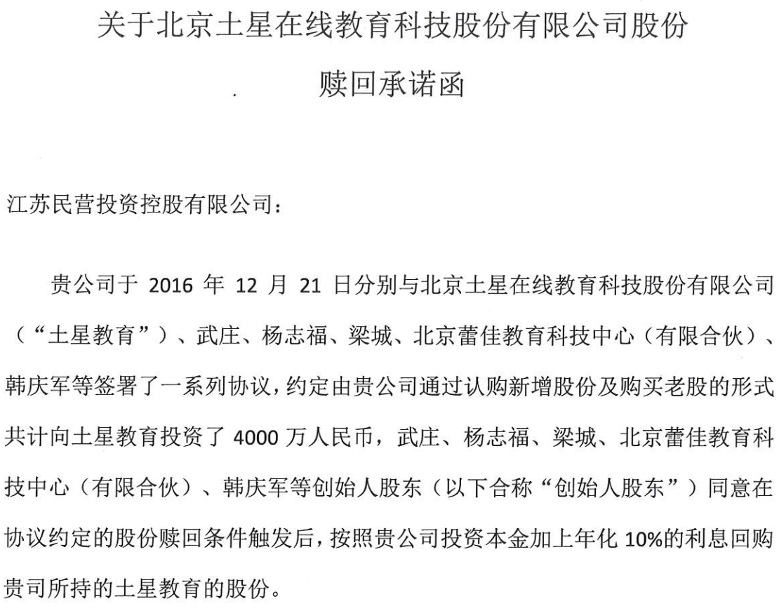 武庄等人之所以进行债权转让,是为了偿还其对苏民投的到期债务。这笔债务的形成则要追溯到2016年12月,苏民投与武庄等人签署了ST土星定增及购买老股协议,苏民投通过“定增(86万股、30元/股)+购买老股(142万股、10元/股)”合计向ST土星投资4000万元。此次投资签署了对赌协议,一旦触发股份赎回条款,武庄等人需在苏民投投资本金加上年化10%的利息回购苏民投所持的ST土星股份。