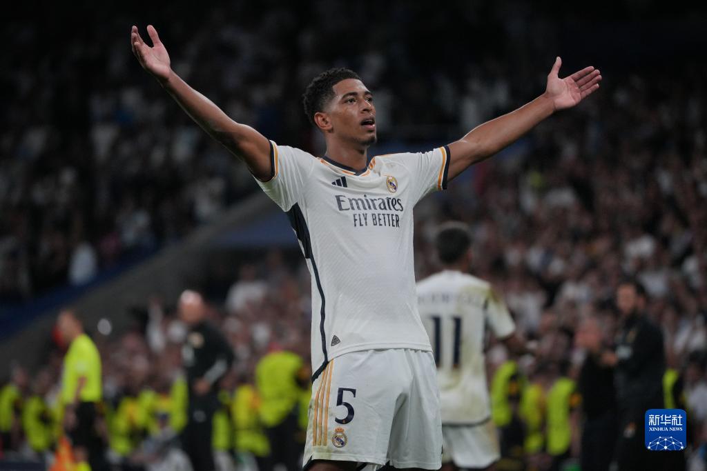 9月20日,皇家马德里队球员贝林厄姆在比赛中庆祝进球。新华社发(张宇恒 摄)