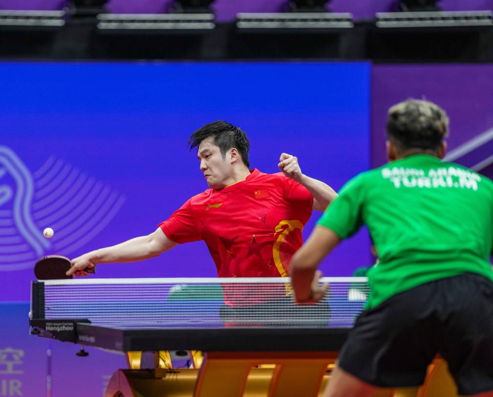 9月22日,中国队选手樊振东(左)在比赛中回球。他以3:0战胜沙特阿拉伯队选手图尔基·拉菲·H 穆塔伊里。新华社记者 孙非 摄