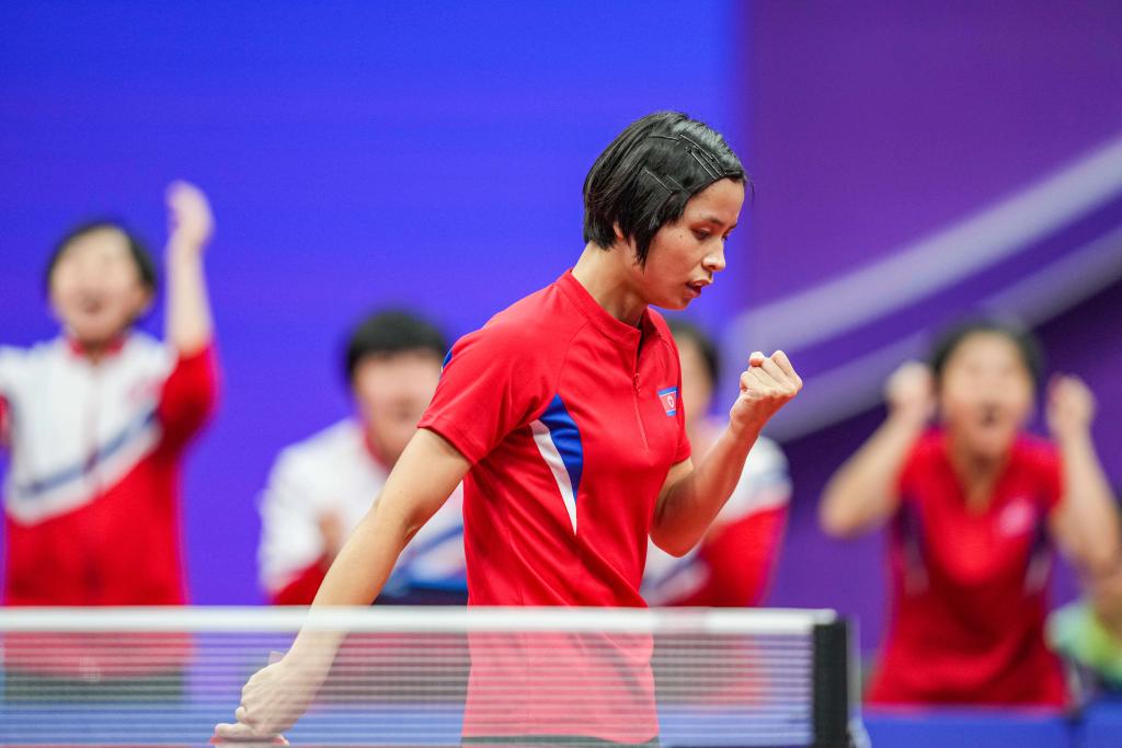 9月22日,朝鲜选手卞松京在与中国台北队选手陈思羽的比赛中庆祝得分。新华社记者 孙非 摄