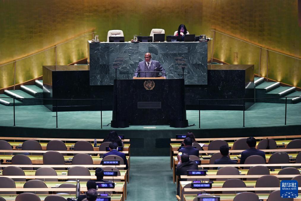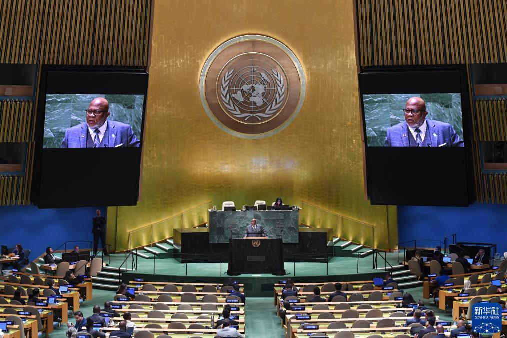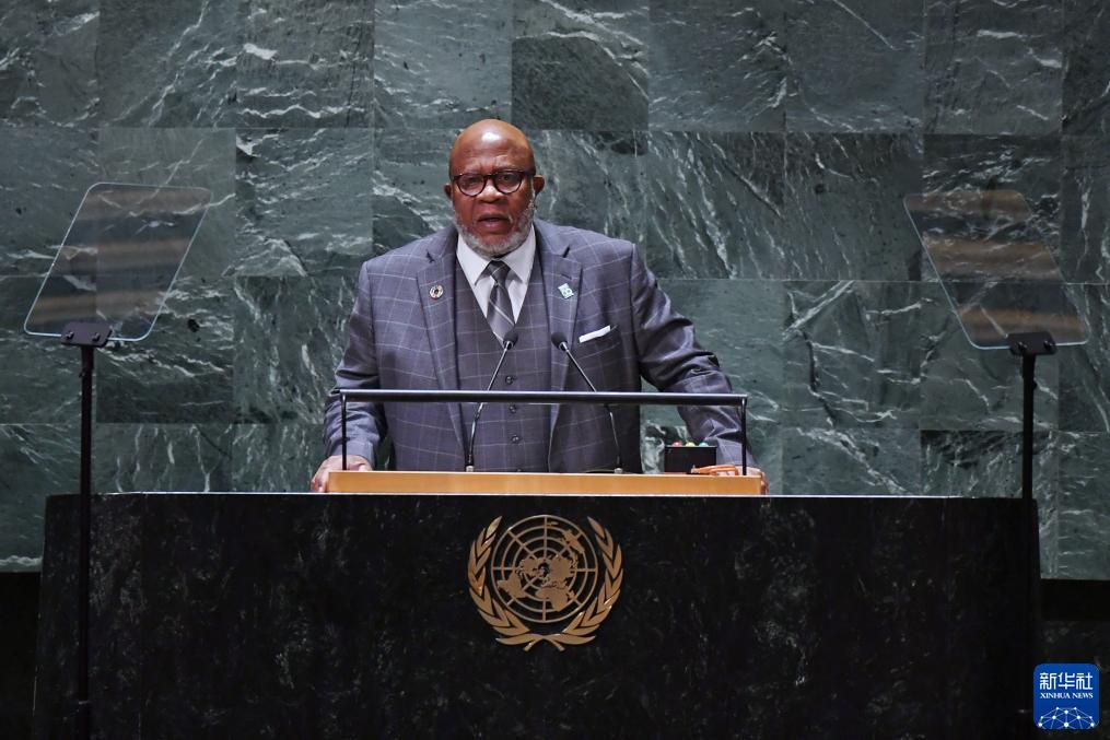 9月26日,在位于纽约的联合国总部,第78届联大主席弗朗西斯(中)发表联合国大会一般性辩论闭幕讲话。 新华社记者李睿摄