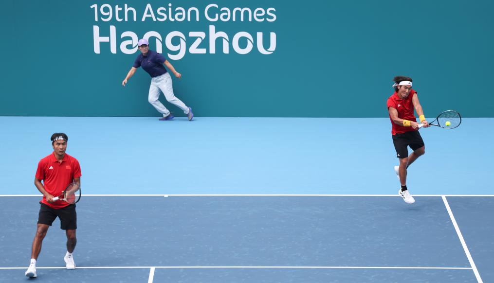 9月24日,特日格乐/布云朝克特(右)在比赛中。当日,在浙江杭州进行的杭州亚运会网球男子双打第一轮比赛中,中国组合特日格乐/布云朝克特以1比2不敌中国台北组合许育修/庄吉生,止步第一轮。新华社记者 孟晨光 摄