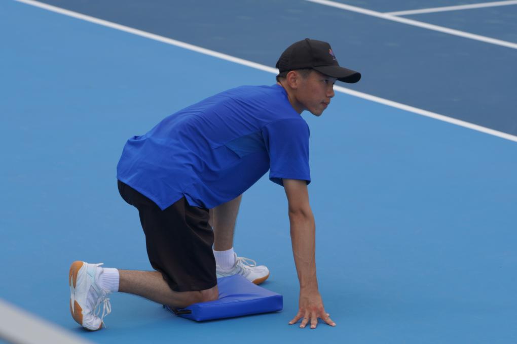 但事实绝非如此。每场比赛的6名球童,需分别值守于底线和网前,目不转睛盯住飞速运转的网球。网前球童时刻保持单膝跪地姿势,底线球童背手站立。死球时,他们要迅速起跑、冲刺、折返,彼此配合,完成捡球、传球、供球等一系列动作,确保比赛流畅运转。