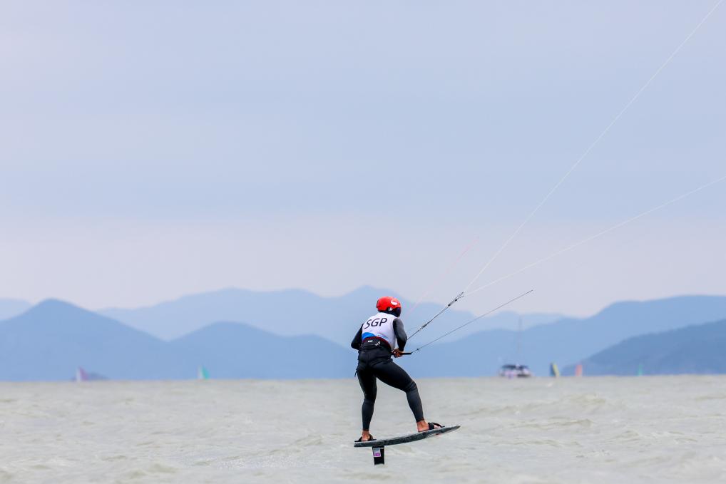 “自从接触水翼风筝板后,我就无法自拔,可以从早玩到晚。”在27日的宁波象山亚运会赛场,墨士廉说。