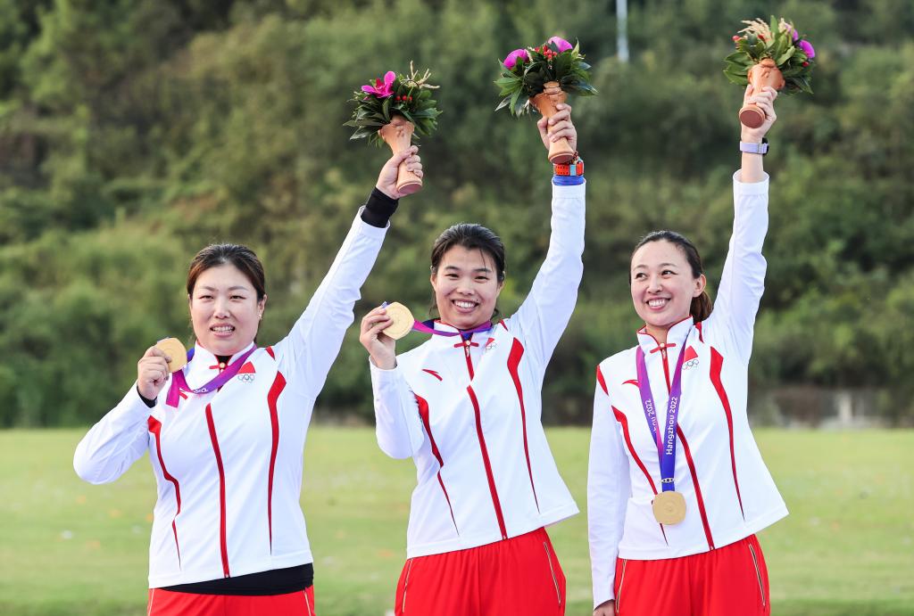10月1日,中国选手李清念(右)、武翠翠(左)、张鑫秋在颁奖仪式上。新华社记者 单宇琦 摄