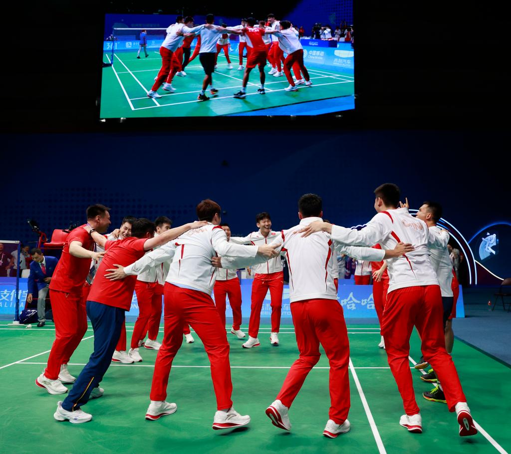 中国羽毛球队当日在男子团体决赛中上演大逆转,在0:2落后的情况下,李诗沣、刘雨辰/欧烜屹和翁泓阳连赢三盘,帮助中国队3:2击败印度队夺冠。但中国女队却在决赛中0:3不敌韩国队。