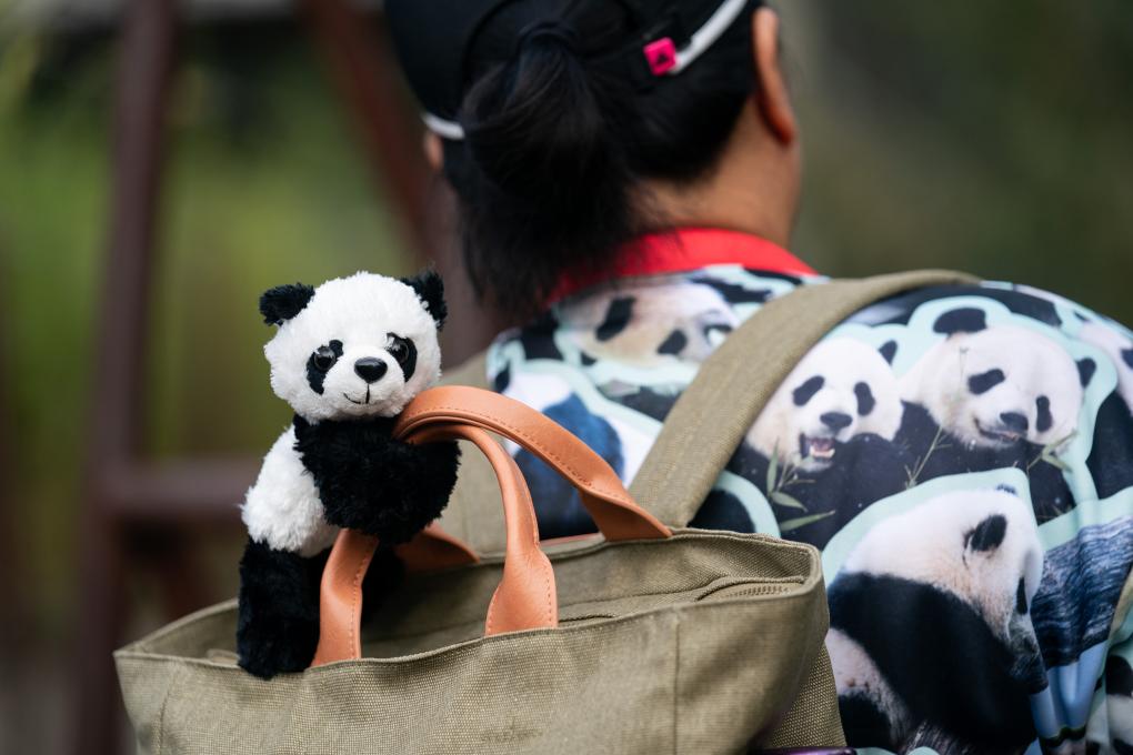 这是9月30日在美国华盛顿史密森学会国家动物园拍摄的游客背包上的大熊猫玩偶。新华社记者刘杰摄