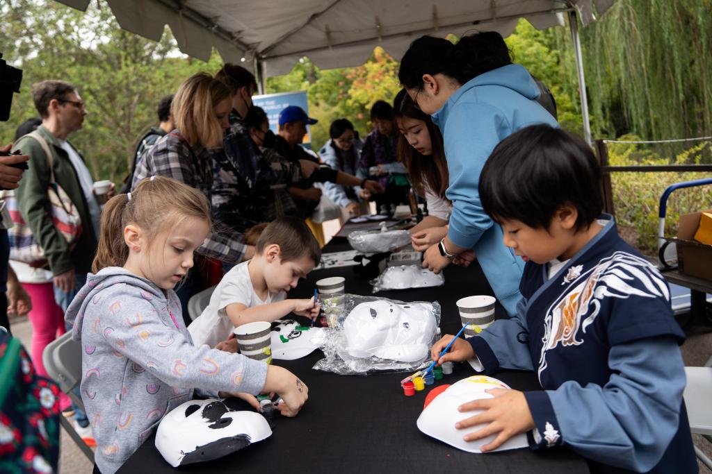 9月30日,在美国华盛顿史密森学会国家动物园,小朋友们制作大熊猫主题面具。新华社记者刘杰摄