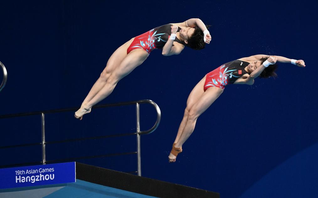 10月1日,在杭州亚运会女子双人3米跳板决赛中,陈艺文(左)/昌雅妮以335.73分获得冠军。新华社记者 杜宇 摄