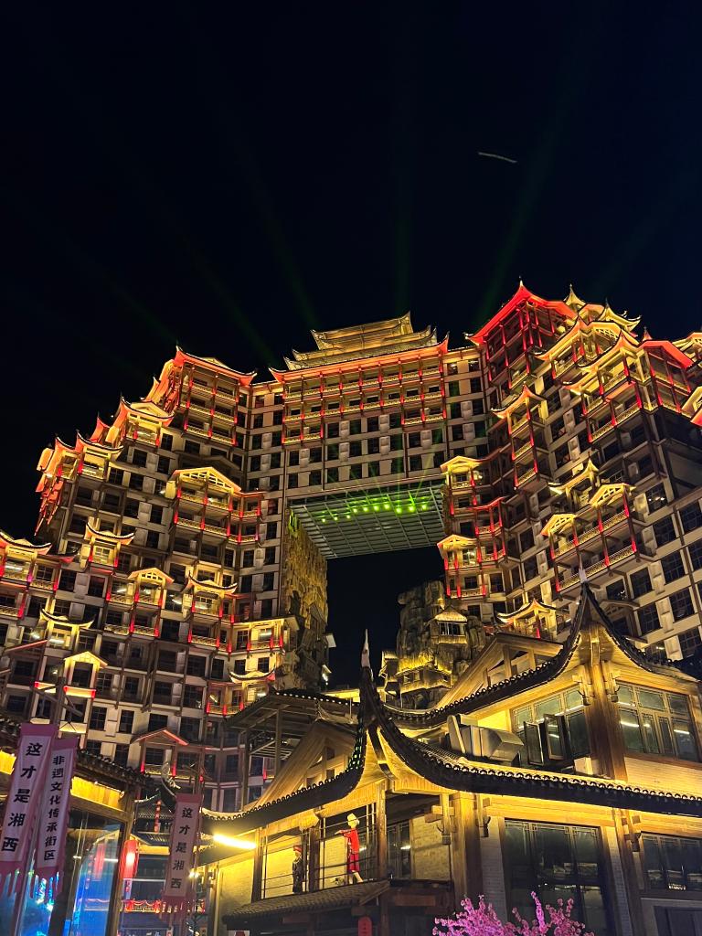 夜幕降临,华灯初上。在张家界市永定区的七十二奇楼景区,一幢百余米高的吊脚楼在灯光映射下显得绚丽耀人。景区内游人如织,各地游客不仅能在美食街大饱口福,还能在工坊近距离欣赏和体验非遗、在彩灯嘉年华里“打卡”拍照、在实景演艺街区沉浸“入戏”。