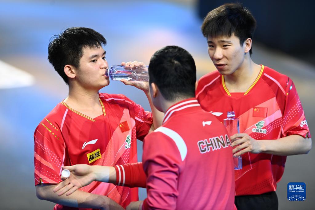 10月7日,中国组合林诗栋(左)/徐瑛彬(右)与教练在比赛间隙讨论战术。新华社记者 范培珅 摄