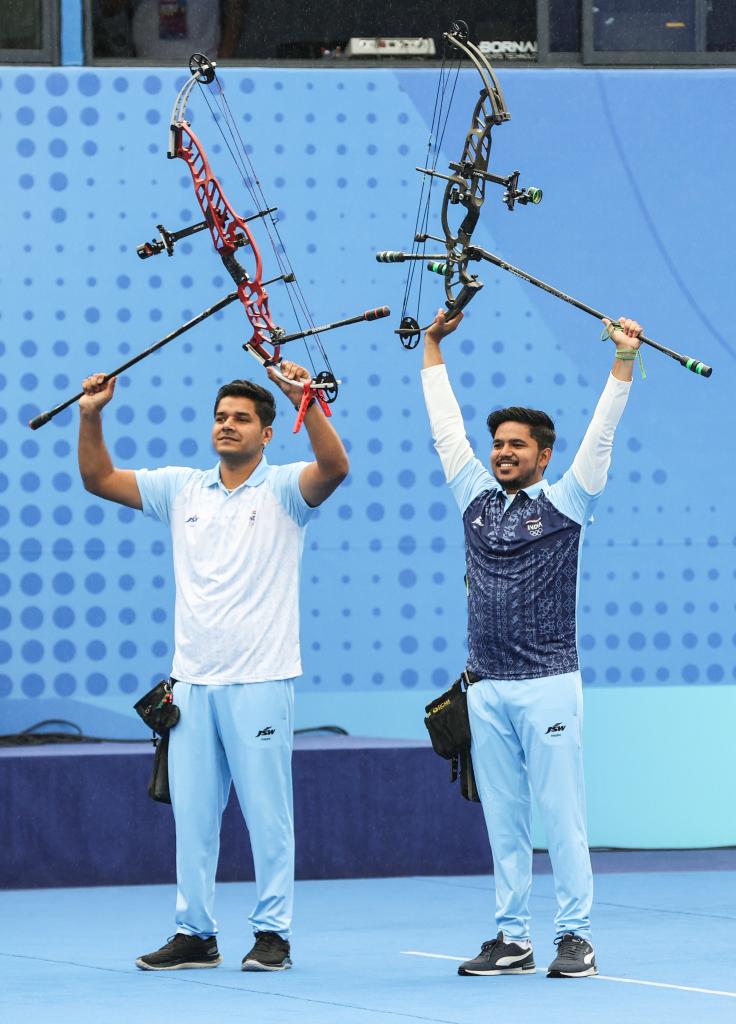 10月7日,在杭州亚运会射箭项目男子复合弓个人赛中,印度选手奥贾斯·普拉温·德奥塔莱(右)获得冠军。新华社记者 单宇琦 摄