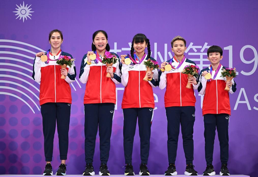 10月7日,杭州亚运会藤球女子单组比赛落幕。冠军泰国队在颁奖仪式上。新华社记者 陈钟昊 摄