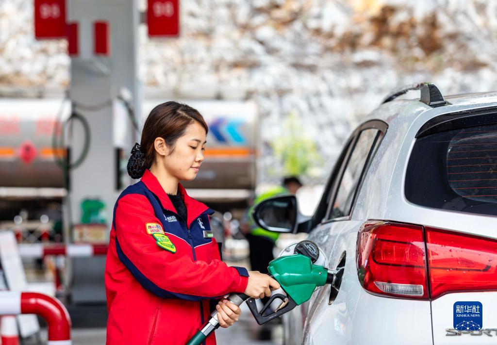 10月10日,贵州省黔西市一加油站的工作人员在为汽车加油。新华社发(范晖 摄)