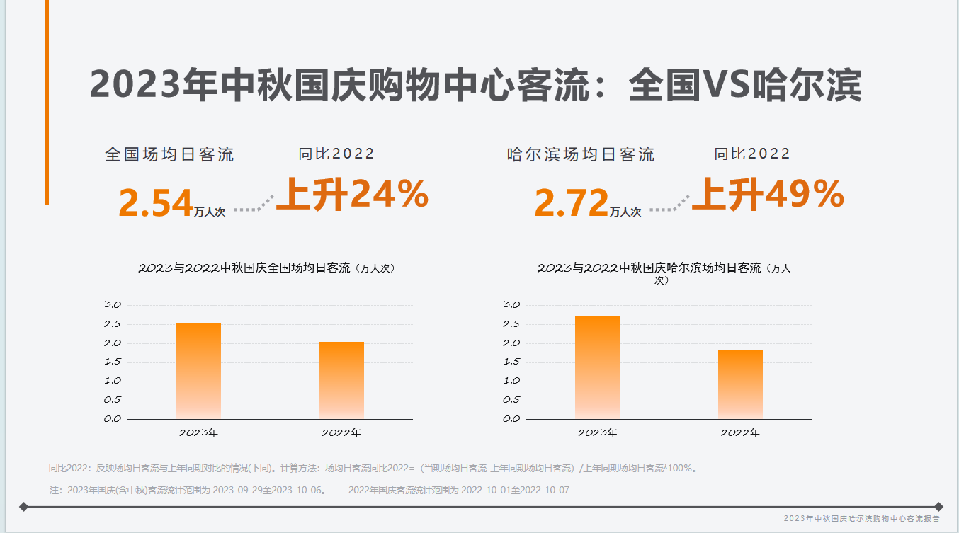 新华网北京10月11日电(陈延特) 据“2023年中秋国庆哈尔滨购物中心客流指数报告”(以下简称“报告”)显示,2023年中秋国庆“双节”强强联手,全国场均日客流2.54万人次,同比增长24%,哈尔滨市购物中心场均日客流2.72万人次,同比增长49%,商圈消费市场热度高涨,位居沈阳、长春、大连4座城市第一。