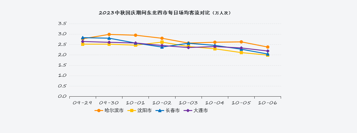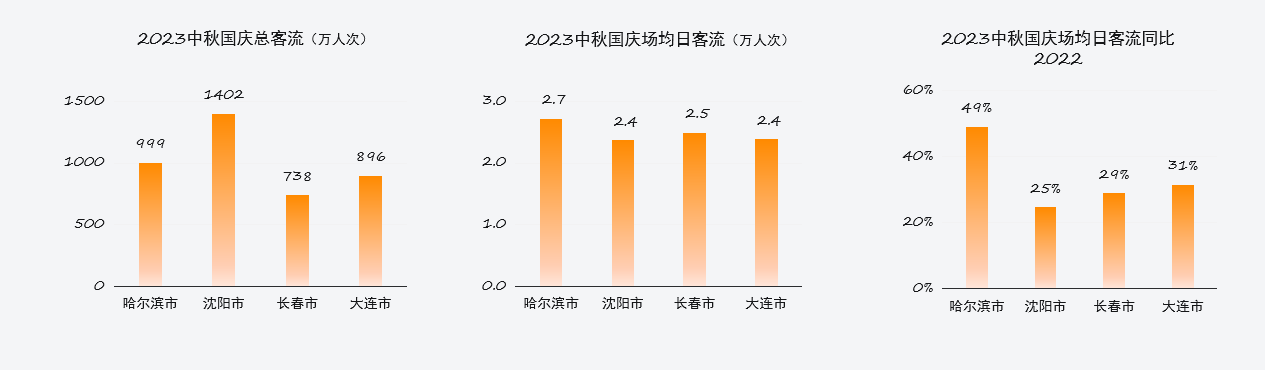 报告显示,哈尔滨购物中心市场表现火热。在2023年中秋国庆期间,哈尔滨购物中心总客流为999万人次,在“东北4市”中排名第二,仅次于沈阳。哈尔滨场均日客流2.7万人次,同比2022年国庆增加49%,在“东北4市”中均排名第一。
