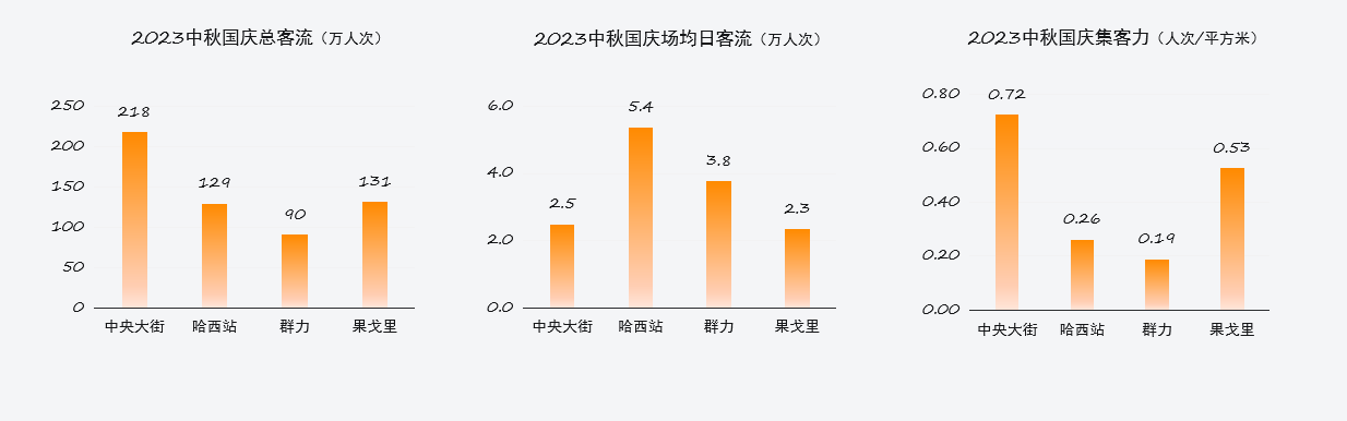 其中除9月29日外,哈尔滨购物中心场均日客流均排名第一。数据显示,中央大街商圈总客流达到218万人次,集客力0.72人次/平方米,在哈尔滨核心商圈中均位列第一。哈西站商圈场均日客流为5.4万人次,高于哈尔滨其他核心商圈。