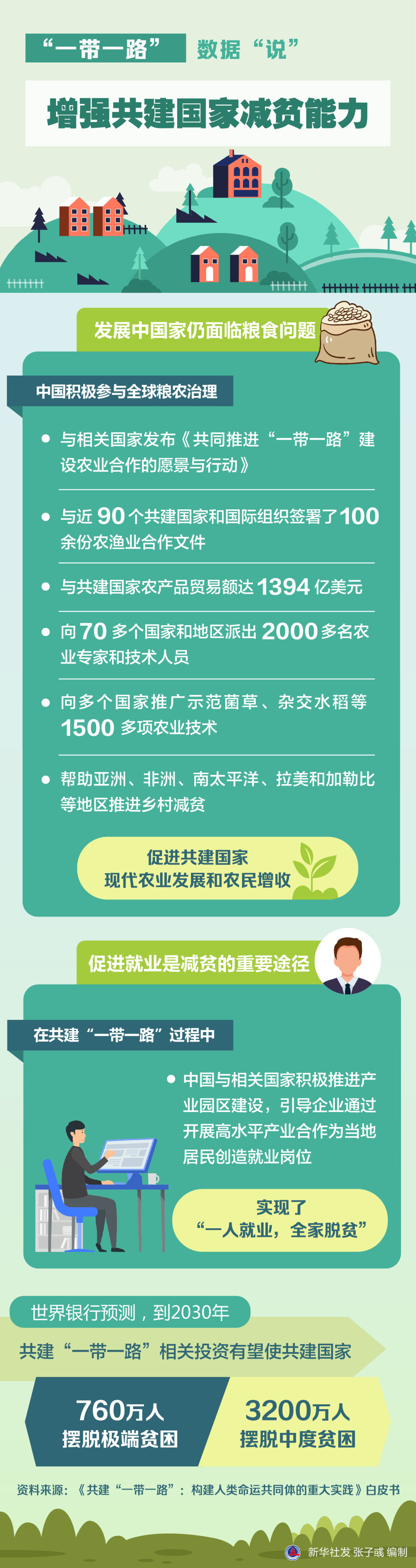 增强共建国家减贫能力。发展中国家仍面临粮食问题。中国积极参与全球粮农治理,与相关国家发布《共同推进“一带一路”建设农业合作的愿景与行动》,与近90个共建国家和国际组织签署了100余份农渔业合作文件,与共建国家农产品贸易额达1394亿美元,向70多个国家和地区派出2000多名农业专家和技术人员,向多个国家推广示范菌草、杂交水稻等1500多项农业技术,帮助亚洲、非洲、南太平洋、拉美和加勒比等地区推进乡村减贫,促进共建国家现代农业发展和农民增收。促进就业是减贫的重要途径。在共建“一带一路”过程中,中国与相关国家积极推进产业园区建设,引导企业通过开展高水平产业合作为当地居民创造就业岗位,实现了“一人就业,全家脱贫”。麦肯锡公司的研究报告显示,中国企业在非洲雇员本地化率达89%,有效带动了本地人口就业。世界银行预测,到2030年,共建“一带一路”相关投资有望使共建国家760万人摆脱极端贫困、3200万人摆脱中度贫困。