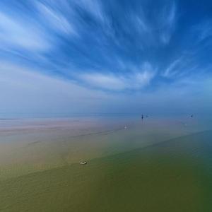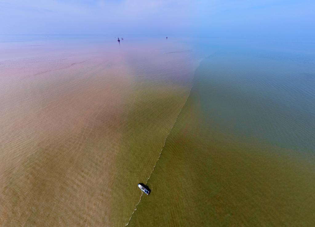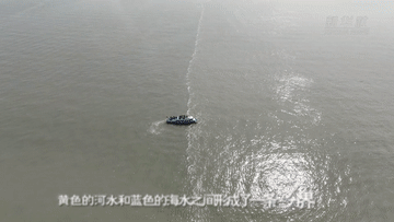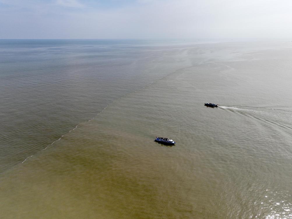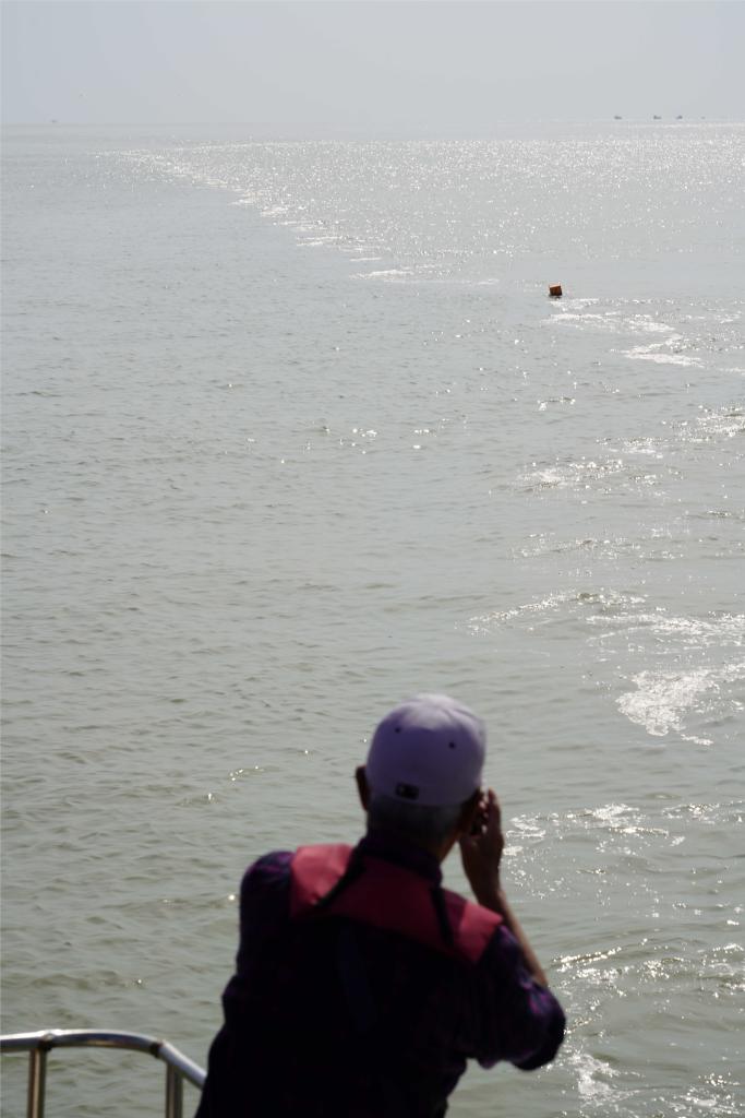 10月12日,在黄河入海口,游客在船上拍摄黄河与渤海交汇。