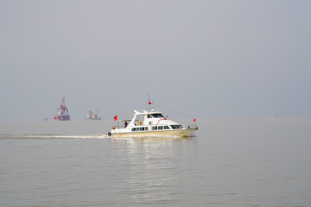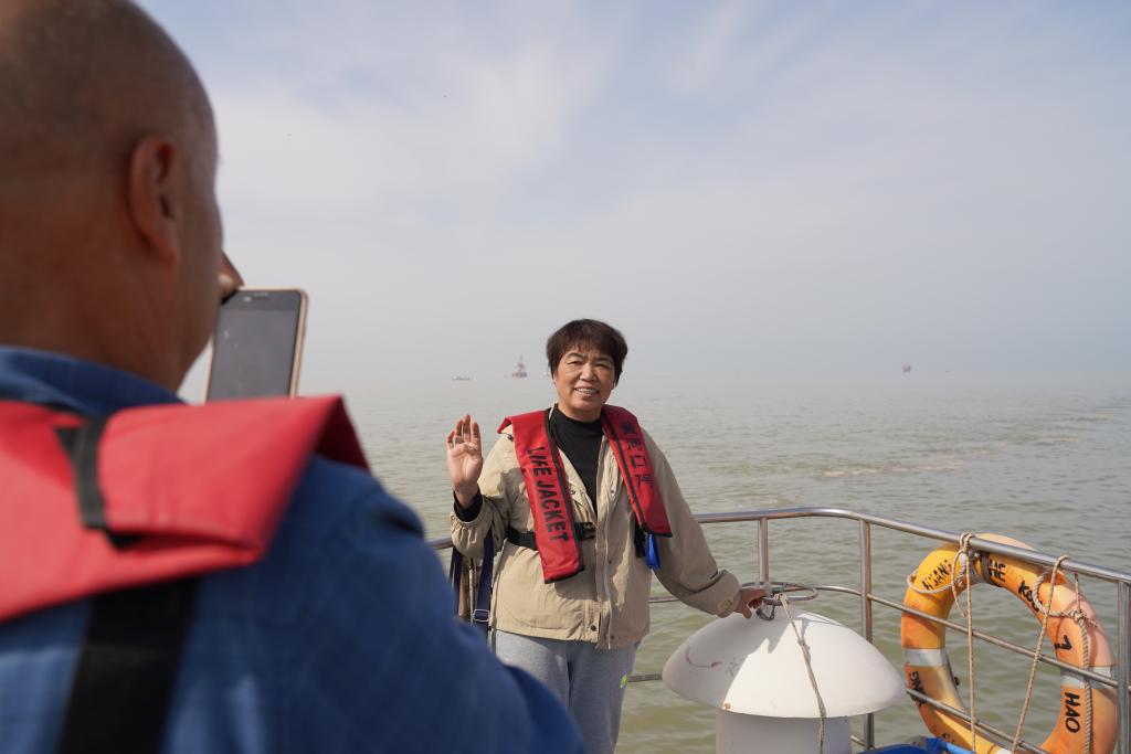 10月12日,在黄河入海口,游客在船上拍照留念。