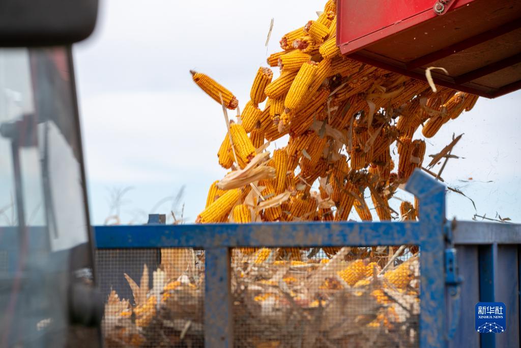 10月18日,在黑龙江省绥化市北林区张维镇润地农业种植合作社的一处玉米地,收割机卸下刚刚收获的玉米。