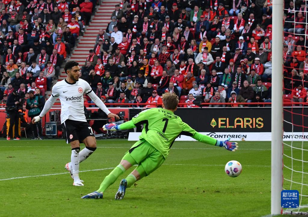 11月4日,法兰克福队球员马尔穆什(左)在比赛中射门得分,打进球队本场第二粒进球。新华社记者 任鹏飞 摄
