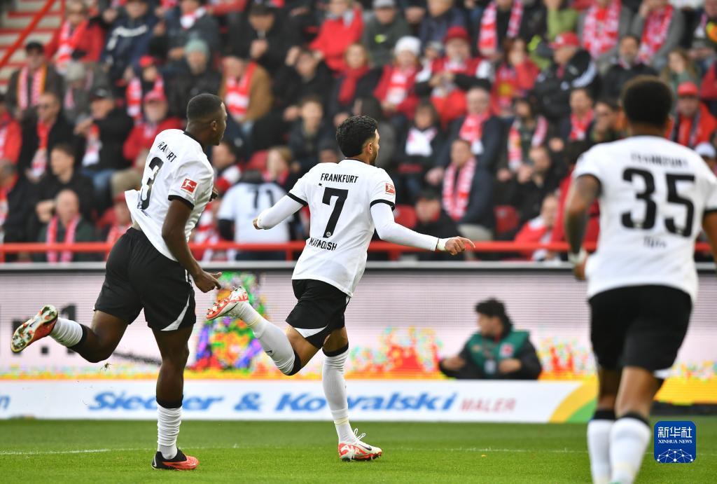 11月4日,法兰克福队球员马尔穆什(中)在打进球队本场首粒进球后庆祝。新华社记者 任鹏飞 摄