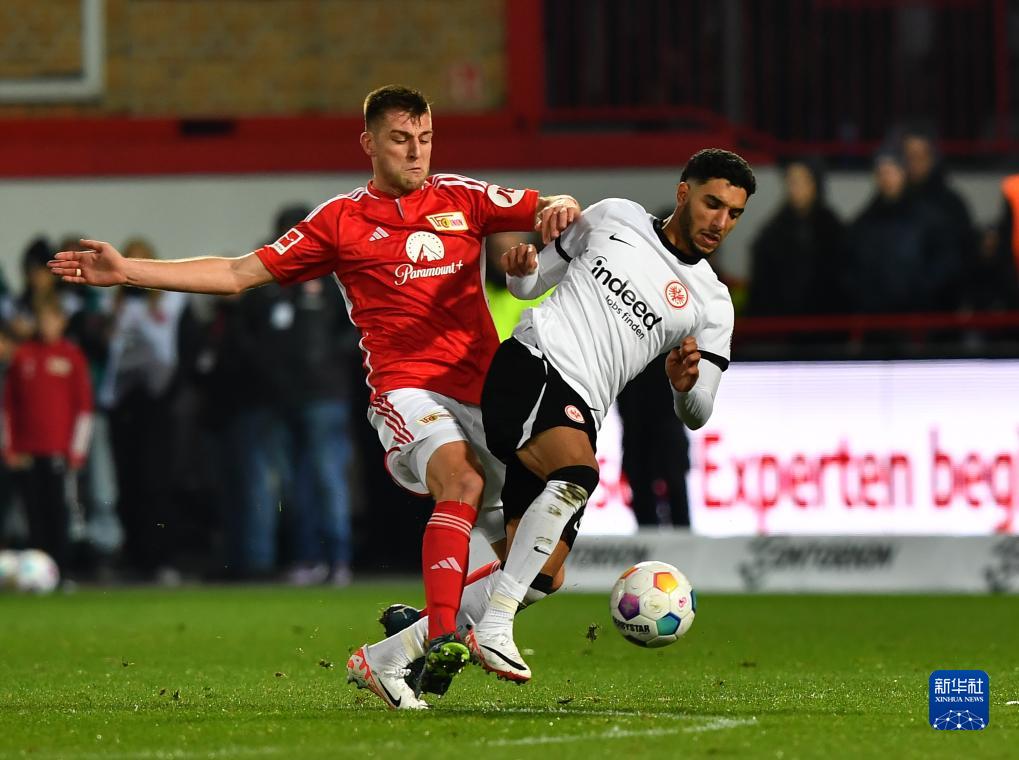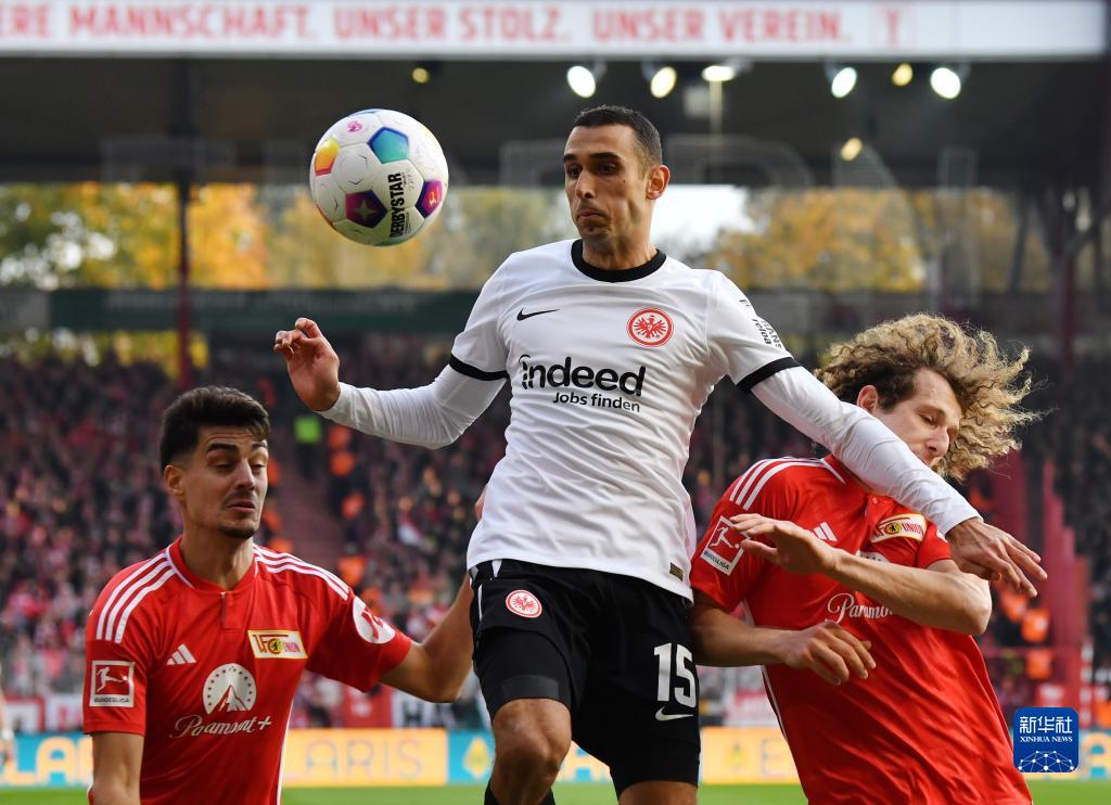11月4日,柏林联合队球员阿伦森(右)与法兰克福队球员布塔在比赛中拼抢。新华社记者 任鹏飞 摄