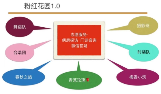 团结粉红公益伙伴。粉红花园与资深乳癌公益组织、慈善基金会、知名化妆品企业、互联网公司、兄弟医院结为公益伙伴,组织开展公益查体、公益募捐等活动。加入乐活者联盟,该联盟目前已经发展为全国多家医院共同参与的大型乳腺癌公益组织,这也让粉红花园在业内的影响力日益扩大。