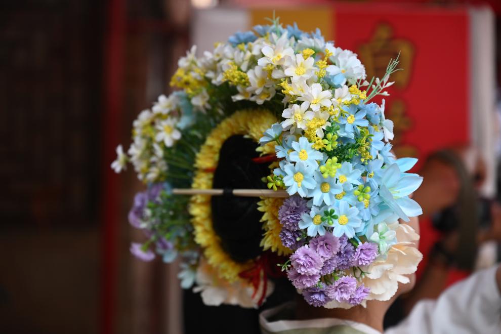 盎然景致于头上盛放——花苞串成花环围在脑后,鲜艳的花朵热烈盛开于发髻之间。在蟳埔村,无论是巷子里拍照的姑娘,还是街边满头银发撬海蛎的阿婆,都盘发梳成圆髻,系上红头绳,插着满头花。