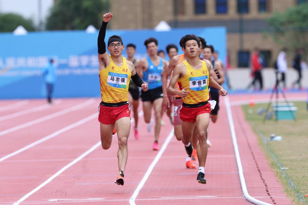 11月13日,北京队选手马忠强(左)、李俊霖分获首届学青会田径项目大学甲组男子1500米金、银牌。新华社记者吴梓溢摄