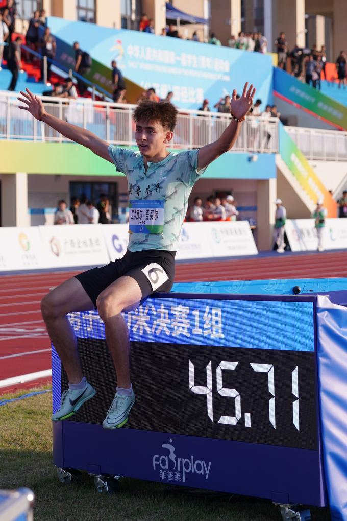 11月2日,乌鲁木齐市队选手艾力西尔·吾买尔打破男子400米全国少年纪录夺冠