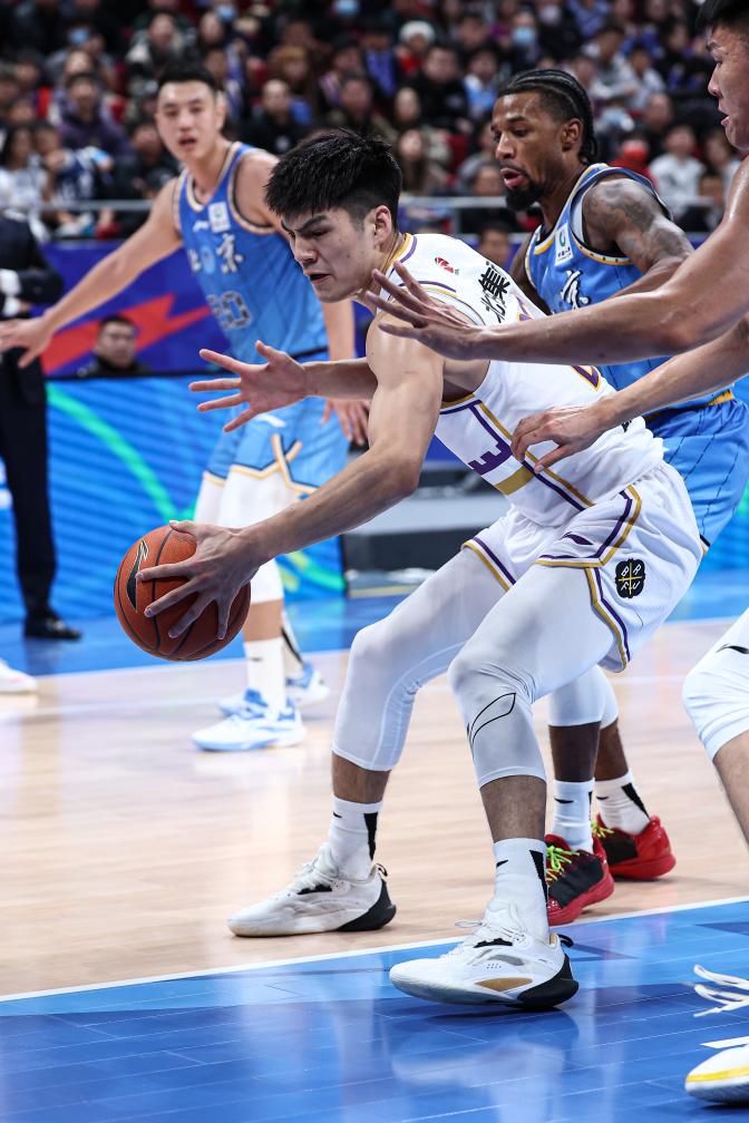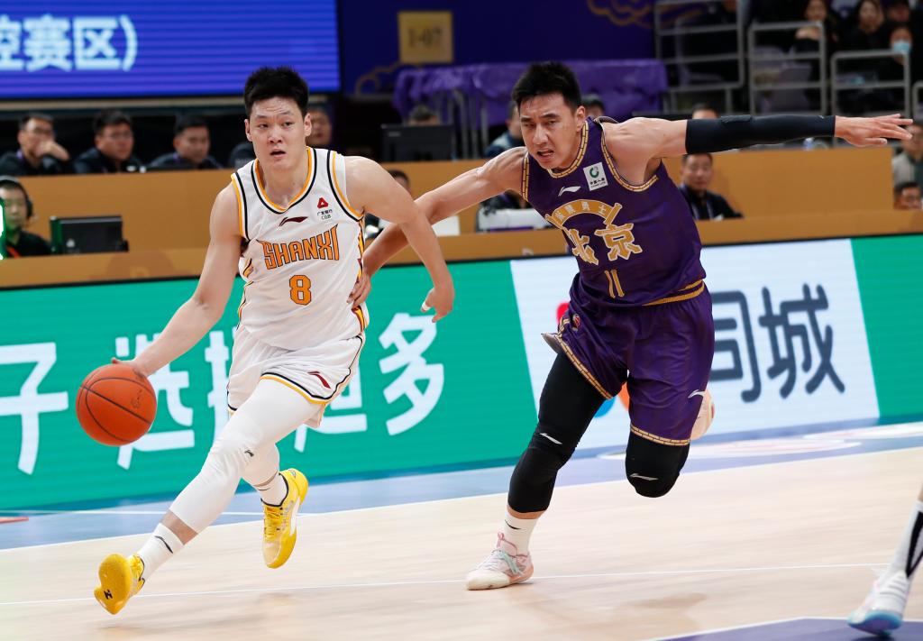 11月6日,效力于山西队的张宁(左)在2023-2024赛季CBA常规赛的比赛中。张宁毕业于北京大学,曾代表北大男篮多次获得中国大学生篮球联赛冠军。新华社记者 雒圆 摄