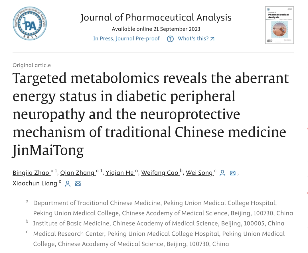 近日,北京协和医院中医科梁晓春教授团队于Journal of Pharmaceutical Analysis(中科院1区)在线发表原创性论著。该研究利用靶向代谢组学技术和多种分子生物学技术,全面揭示了糖尿病周围神经病变(DPN)患者和动物模型中存在的能量代谢异常,并探讨了协和中医科用于临床治疗DPN的中药方剂“筋脉通”通过改善能量代谢从而发挥周围神经保护作用的药理机制,该研究结果为筋脉通的临床应用提供了新的依据。本研究得到了国家自然科学基金及中央高水平医院临床科研专项的支持。