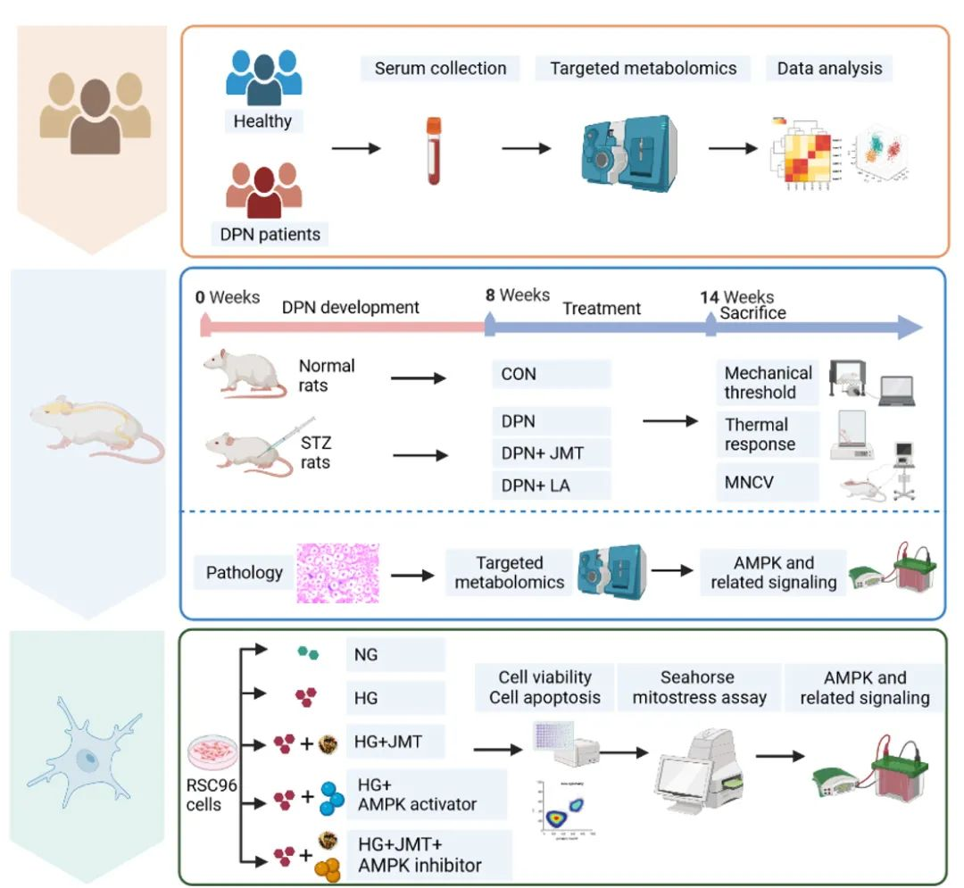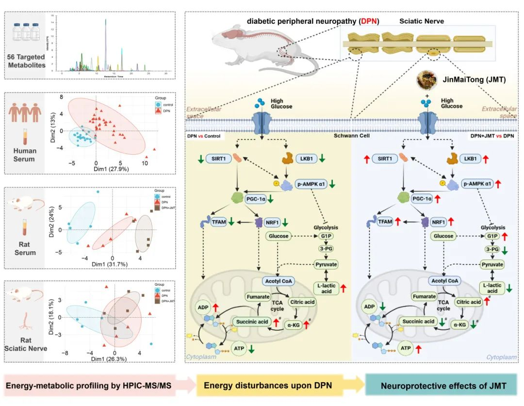 本研究综合采用基于离子色谱-质谱联用的靶向代谢组学技术、细胞生物能量分析技术及多种分子生物学技术,在临床患者、动物及细胞三个层面开展研究,首次系统表征了DPN中存在的能量代谢异常,并在此基础上探究了中药筋脉通的药理机制。