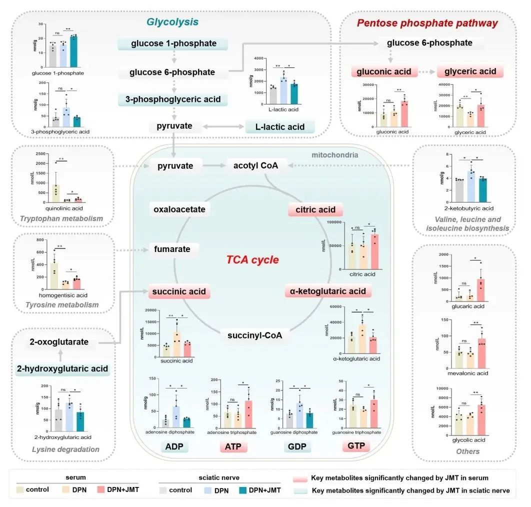 本研究首次揭示了糖尿病周围神经病变相关的能量代谢谱,发现DPN患者及DPN动物模型的循环系统及周围神经中均存在显著的能量代谢异常。中药筋脉通可以通过激活AMPK/PGC-1α通路,改善能量代谢的多个途径,从而缓解DPN症状、减轻周围神经损伤。中药“多成分、多靶点”的作用特点,既是其发挥临床疗效的关键,也是阐明其药理机制的难点。本研究不仅揭示了中药筋脉通“整体调节”的作用特点,也为其治疗DPN提供了新的科学依据。