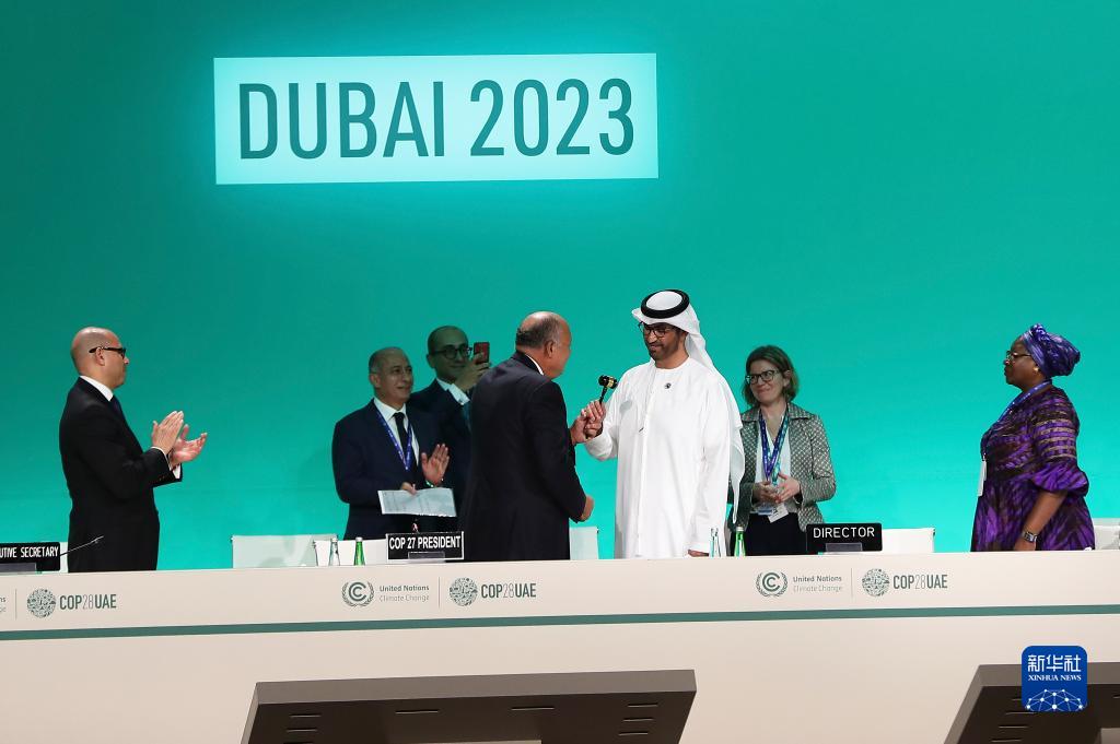 11月30日,在阿联酋迪拜的联合国气候变化迪拜大会开幕现场,COP27主席舒凯里(前左)和COP28主席苏尔坦·贾比尔(前右)交接主席职务。 新华社记者 王东震 摄